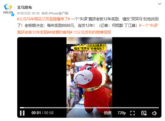 1月23日,据@义乌发布讯息称:缝反“哭哭马”的他找到了!雇主娘决定:每年奖励8888元,连发12年!