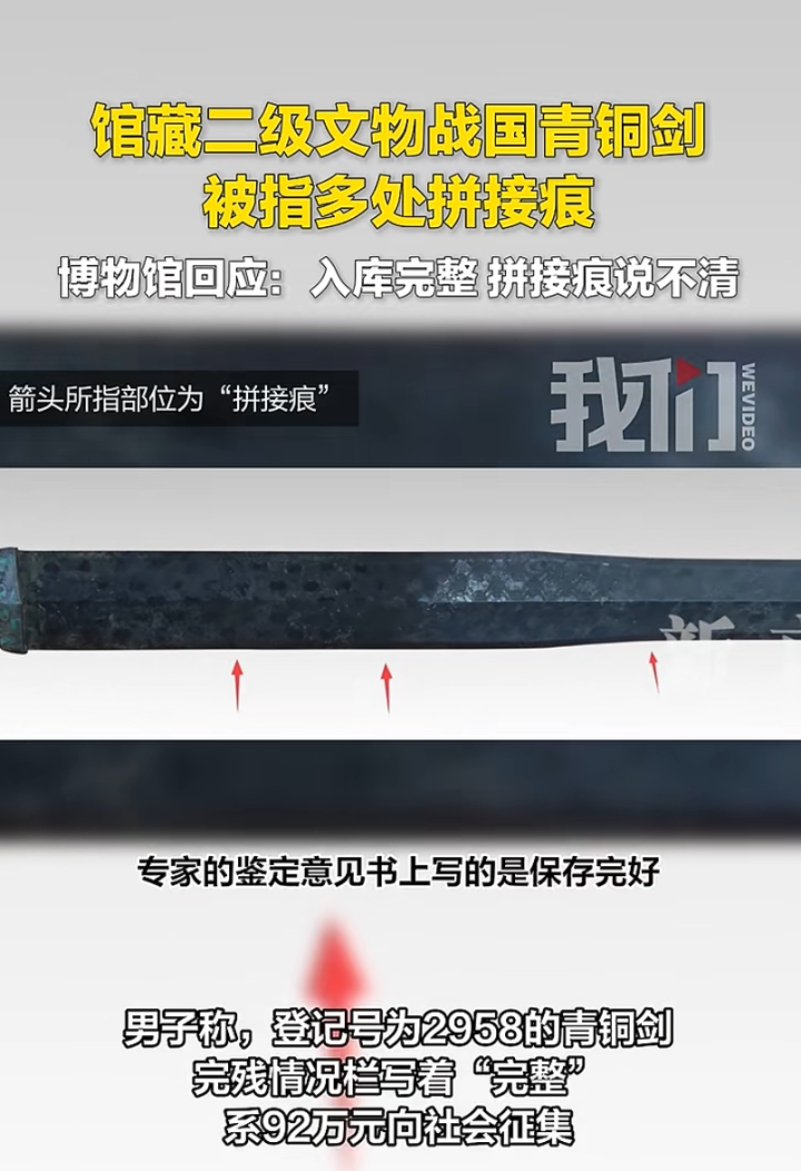 据须眉先容,登记号为2958的二级文物青铜剑完残情况栏写着“完竣”,系92万元向社会搜集,“这剑搜集来后一直保存在库房,直到2023年叮嘱时发现多处拼接印迹”。
