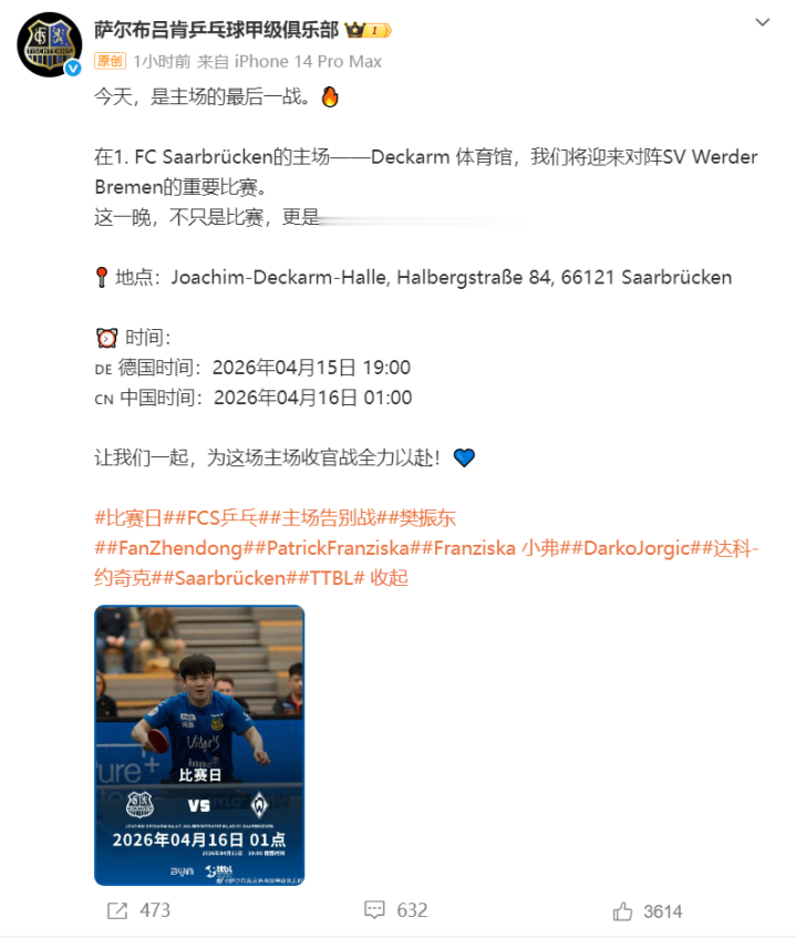北京时分16日凌晨1时,樊振东将迎来在萨尔布吕肯俱乐部主场的收官告别战。@萨尔布吕肯乒乓球甲级俱乐部发博示意:这一晚,不仅仅比赛,更是一段旅程的告别与致意。