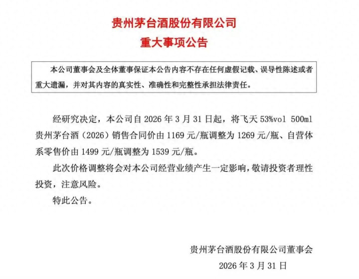 3月30日晚,贵州茅台发布公告称:自2026年3月31日起,将飞天53%vol 500ml贵州茅台酒(2026)销售协议价由1169元/瓶调遣为1269元/瓶、自营体系零卖价由1499元/瓶调遣为1539元/瓶。