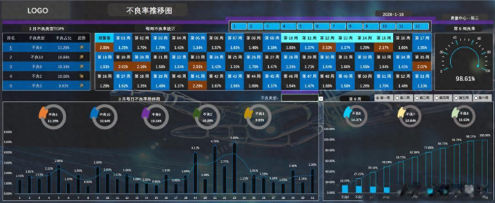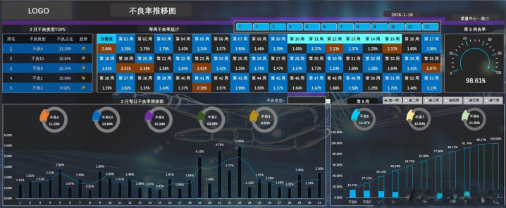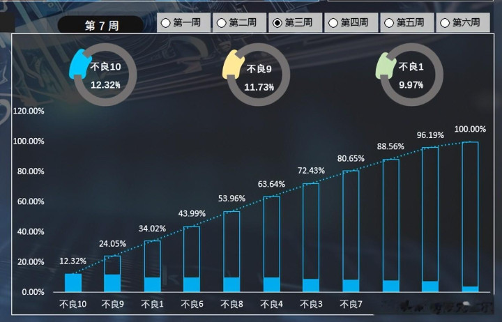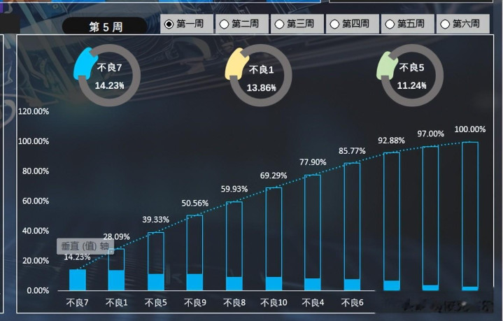 5、周数据统计:图表右下角通过柏拉图的方式统计当前月对应每周的不良类型,最右侧的仪表盘则显示当前周的良率。