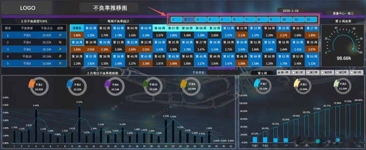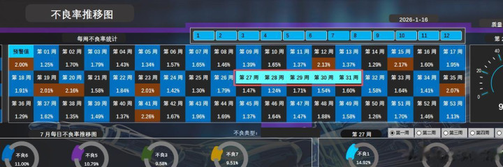 2、 每周不良率统计:图表上方通过方格的形式直观的显示当前年度每周的不良率数值。并通过高亮的方式显示当前选择月份对应周别的不良率数据。