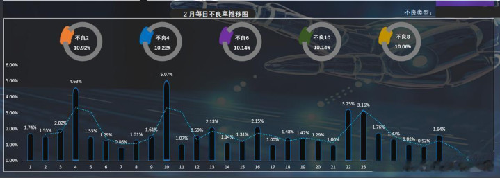 4、不良率推移图:图表左下角通过直方图的方式显示对应月份的不良率推移图,并自动统计当月每日不良率变化趋势,切换月份后,不良率推移图会自动切换(图表上方5个环形图分别显示当月不良率最多的5种不良类型和占比)。