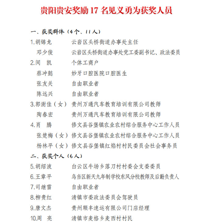 本次受赏赐的17名勇士来自五行八作,有下层干部、个体商户、大夫、教师、村民、快递员……他们是穿梭于三街六市的辽远身影,却在千钧一发之际,以世俗之躯行勇士之事,成为“知行合一、合力图先”贵阳城市精神的纯真注脚。