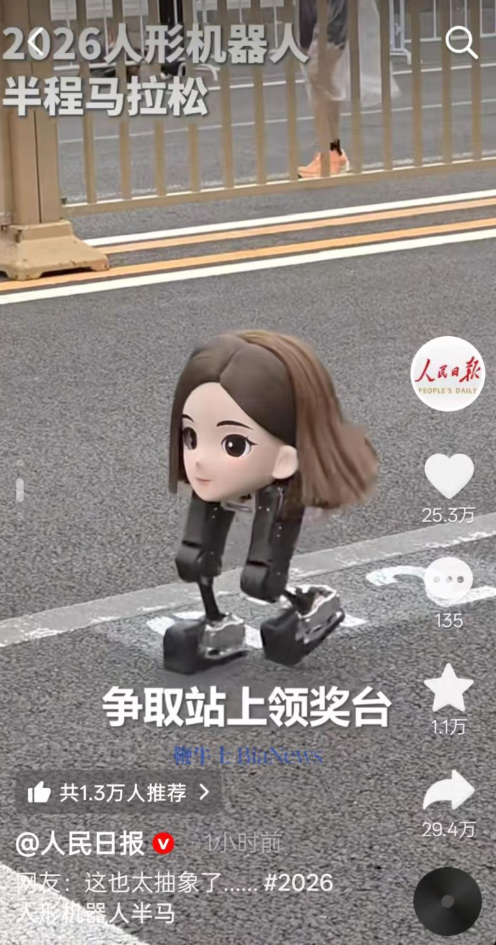 关系画面被网友拍摄后发布至酬酢媒体平台,“豆包机器东说念主跑半马”话题赶快冲上热榜。